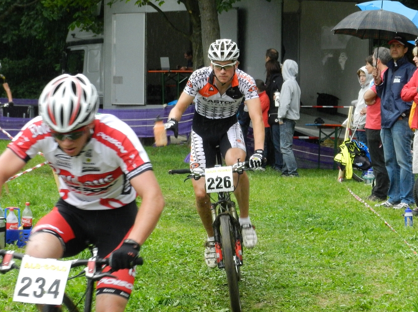 So begann ich das über 5 Runden geführte Rennen vom Start weg sehr verhalten, wollte diese Taktik jedoch nicht lange beibehalten. So attackierte ich bereits in der Einführungsrunde und lag bei der ersten Zieldurchfahrt auf Rang 21. Doch damit wollte ich mich bei diesem Rennen nicht zufrieden geben. Noch immer hatte ich das Ausscheiden, durch technischen Deffekt, in aussichtsreicher Positon vom letzten Jahr bei der BaWü in St. Märgen im Kopf. Ich versuchte weiterhin zu attackieren unde trotzdem nicht unkontrolliert zu fahren und machte in den folgenden Runden vor allen in den technischen Teilen der Strecke Platz um Platz gut.