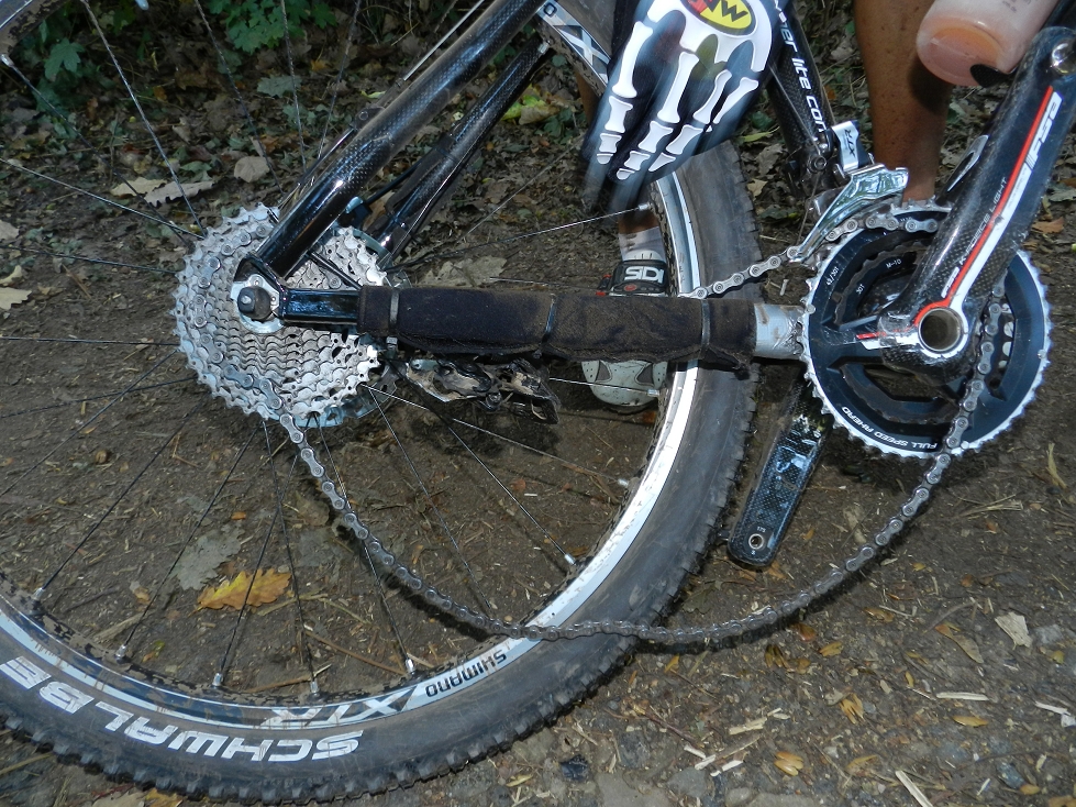 Beim beschleunigen aus dieser Abfahrt heraus gab es einen Schlag, und ich hatte Glück dass ich nicht mit dem Kopf voraus über mein Rad stürzte, mit viel Mühe entkam ich einem Sturz. Es hatte das komplette Schaltwerk mitsamt Schaltauge abgerissen und dieser war in die Speichen meines Hinterrades geknalltn , dabei hat es mir die Speichen zerissen.