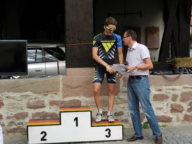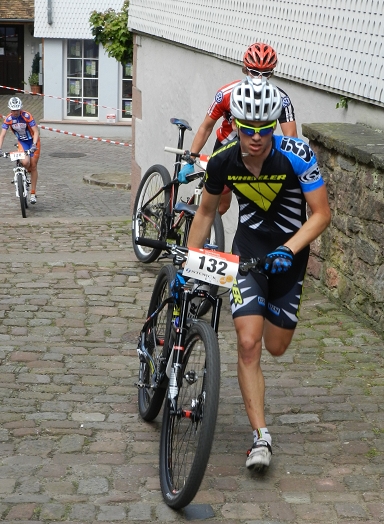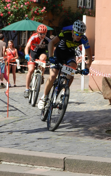 Fahren am Anschlag  war das Motto.  Meinen Start hatte ich mir total versaut, rutschte ich doch aus den Klickis und fiel so erst einmal  ins Mittelfeld zurück, konnte aber schon nach wenigen Metern auf Rang drei nach vorne fahren. In der Folge entwickelte sich spannendes Rennen in dem sich Lutz Starke vom Team Stellwag leicht absetzen konnte.Dennis Böttle vom TV Mosbach und ich  wechselten sich als Verfolger in der Führungsarbeit ab und hatten so unseren  Kontrahenten  meistens in Sichtnähe, allerdings konnten wir nur wenig Boden auf ihn gut machen.  Das  Rennen auf  dem Altstadtkurs  verlangte uns höchste Konzentration ab. Das ständige anbremsen,   sowie das anschließende heraus beschleunigen aus den vielen Kurven ging enorm an die Substanz. Hinzu kamen noch die Laufpassagen  an den Treppen.
