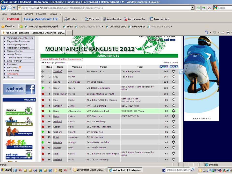 In der BDR Rangliste Mountainbike Junioren belege ich zur Zeit den 6 Rang.